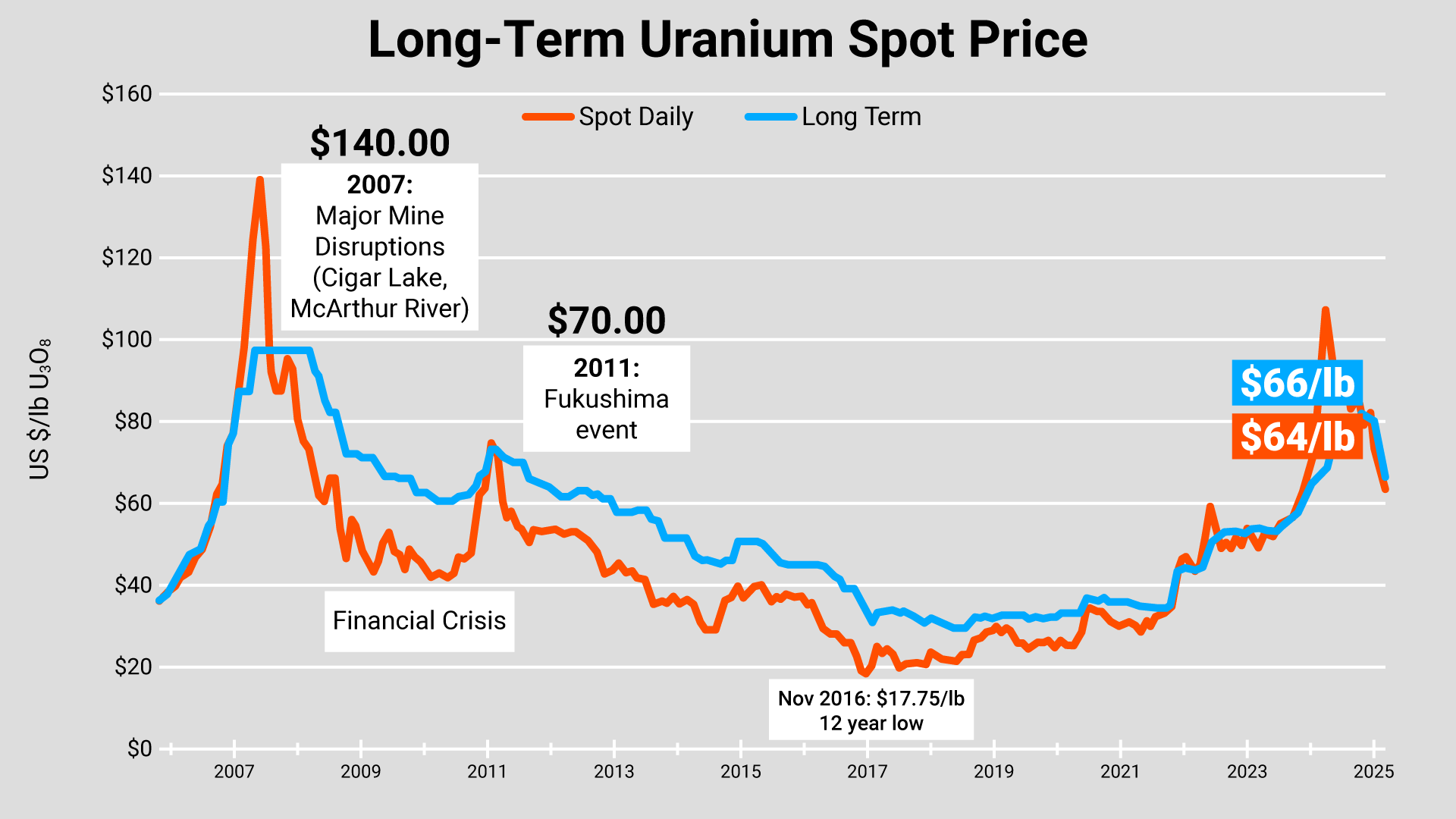 At present, uranium is trading right around $65 per pound. A few short years ago, uranium prices were languishing at the $30/lb level. In other words, the market is experiencing what we would characterize as a temporary pullback in an otherwise longer-term upward trend.